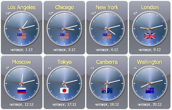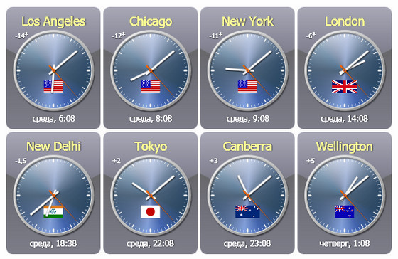 Sharp World Clock - программа, предназначенная для показа мирового времени. Позволяет установить неограниченное число часов в линию или в виде таблицы. Внешний вид часов может иметь различный дизайн, так же часы могут быть цифровыми или обычными, с круглым циферблатом, часы способны показывать флаг страны и изменяемы в размерах от очень маленьких до полноэкранных. Программой поддерживается множество стилей. Настраиваемый список городов каждой страны мира. Вы сможете добавлять, изменять и редактировать города.