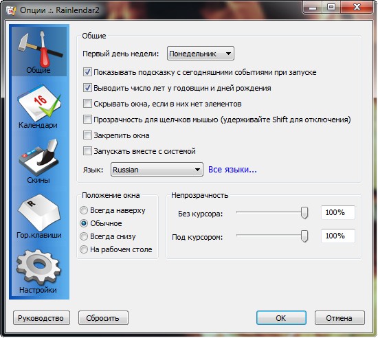 Rainlendar - календарь для рабочего стола, поддерживающий список задач на тот или иной день. Есть возможность переноса настроек из Microsoft Outlook. Возможна смена скинов и изменение уровня прозрачности. Поддерживаются плагины, горячие клавиши и многоязычный интерфейс.