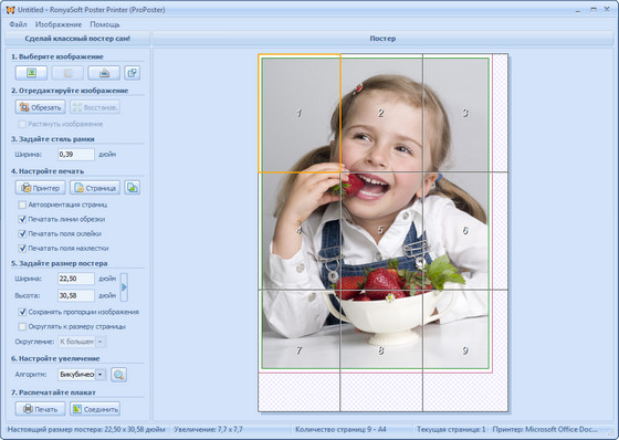 RonyaSoft Poster Printer - программа для создания и печати больших плакатов, знаков, рекламных объявлений без использования специальных плоттеров просто на стандартном принтере. Для создания плаката может быть использован любой рисунок, изображение, документ Microsoft Word, таблица или график Excel. Также возможна печать плаката с цифровой фото камеры или со сканера. Удобный интерфейс и простота использования позволяют за считанные минуты создать высококачественный огромный плакат. Просто выбери рисунок и размеры и запусти на печать.