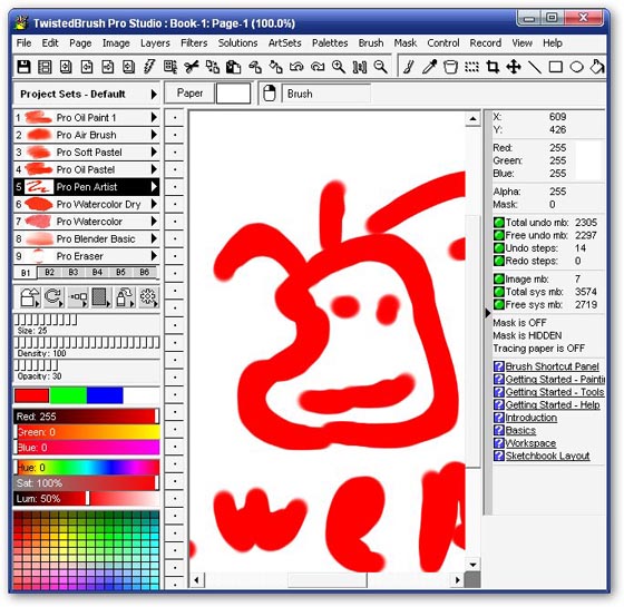 TwistedBrush - программа для художников. Она имеет большое количество самых разнообразных инструментов для рисования, от красок до мелков и карандашей. Эта программа глубоко поражает буквально с первого запуска. Интерфейсом Twisted-Brush мало похож на другие редакторы, хотя и предоставляет все необходимые возможности: работа с буфером обмена, зуминг и, конечно же, рисование.