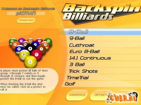 Oдин из самых замечательных бильярдов, который отличается великолепной графикой, современной физикой и благоприятным интерфейсом. Backspin Billiards Deluxe содержит в себе целую серию различных бильярдов: это знакомая восьмерка; девятка, в котором смысл в том, чтобы загнать последним девятый шар; "14.1" -где нужно забивать шары по одному, одновременно заказывая и шар и лузу, в которую будет наноситься удар; "3 шара" - здесь нужно за наименьшее количество попыток забить три шара; "Гольф" - надо одним шаром забивать другие, минуя различные препятствия из неприкасаемых шаров.