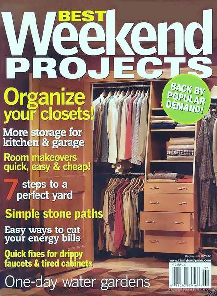 Приближаются выходные, и ты раздумываешь, что бы такого полезного сделать. Предлагаю воспользоваться советами книги "Лучшие проекты выходного дня" от Family Handyman. Она разбита на 6 секций: в первой рассматриваются вопросы хранения вещей (кладовые, гардероб и т.п.); вторая посвящена садовым проектам, третья - мебельным, четвертая - кухне и ванной; в пятой речь идет о полах, стенах и интерьере помещений, и, наконец, шестая секция посвящена различным ремонтным работам.