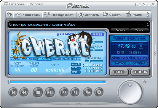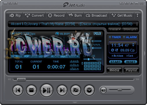 JetAudio — это универсальный проигрыватель музыкальных и видео файлов, риппер, конвертер и т.д., в общем, все в одном комплекте. Программа поддерживает практически все музыкальный форматы, умеет проигрывать MP3, MP2, WAV, MID, REAL AUDIO/VIDEO, S3M, MOD, MPG, AVI, MOV, Video/Audio CD, RealPlayer G2 и некоторые другие форматы мультимедийных файлов. Позволяет записывать аудио компакт-диски или копировать их содержимое на жесткий диск ПК. Есть возможность накладывать на композиции различные эффекты, поддерживается синхронизация для караоке, имеется эквалайзер, конвертер форматов, редактор тэгов, кроссфейдинг, субтитры и т.д.