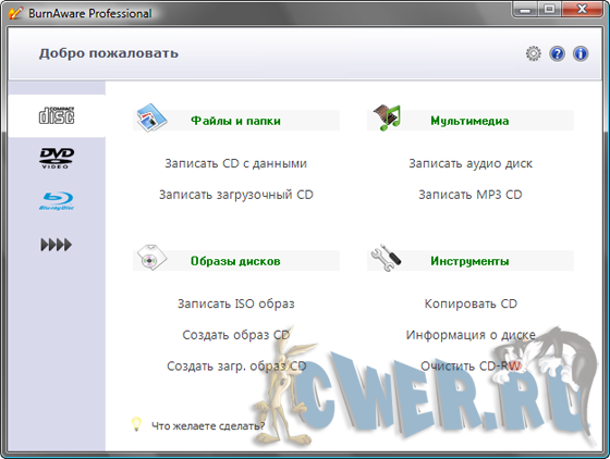 BurnAware Free - относительно небольшая, бесплатная и простая в использовании программа для записи информации и музыкальных композиций на CD, DVD, Blu-Ray и HD-DVD диски, которая пригодится как опытным пользователям, так и новичкам. BurnAware поддерживает работу со всеми типа оптических дисков (включая CD-R/RW, DVD-R/RW, DVD+R/RW, BD-R/RE, HD-DVD-R/RW и DVD-RAM) и аппаратными устройствами записи. Утилита поддерживает создание образов, способна писать мультисессионные диски, имеет опцию проверки записанного содержимого, работает под операционными системами Windows 98/ME/NT/2000/XP/Vista (32/64-bits).