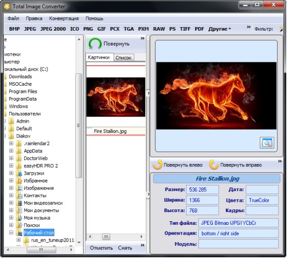 Total Image Converter - преобразует изображения в другие форматы, изменяет размеры и переворачивает фотографии и картинки. Total Image Converter сделает всё, что вам нужно: вы можете конвертировать большие TIFF изображения в маленькие JPEG, подгонять картинки под размеры веб-страницы или преобразовать RAW фотографии в более популярные форматы.