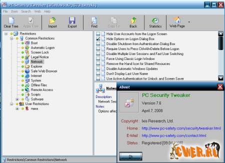 PC Secuity Tweaker - утилита дающая возможность настроить безопасность вашего компьютера, используя скрытые параметры системы Windows. Утилита содержит более 500 недокументированных настроек безопасности системы, спрятанных в недрах системного реестра и позволяющих более плавно руководить процессом безопасности используя оболочку программы, кроме того PC Secuity Tweaker позволяет настроить Internet Explorer для безопасного серфинга.