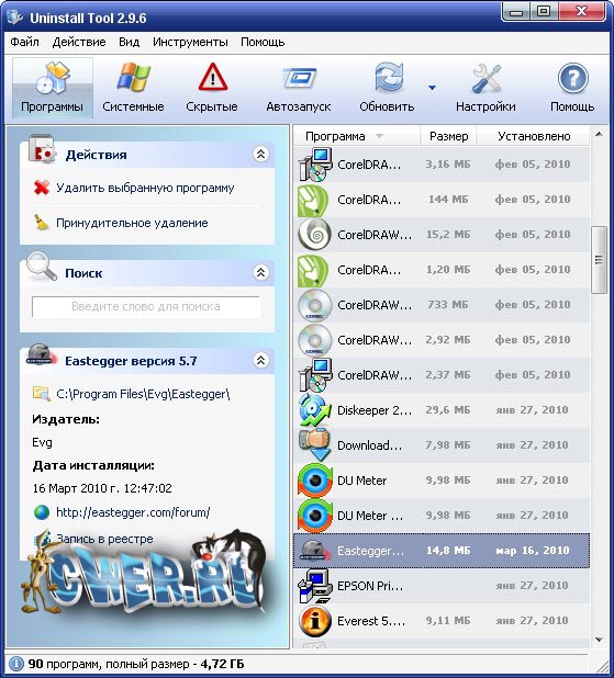 Your Uninstaller обеспечивает решение задач по деинсталляции приложений, установленных на вашем компьютере. Подсвечивает недавно установленный «софт» и автоматически вычищает оставшиеся после удаления ключи реестра и файлы. Уборка мусора, впрочем, одними приложениями не ограничивается. Также можно запросить список автоматически загружаемых программ и контекстное меню Internet Explorer. Может показывать соответствующие значки приложений. Имеется функция поиска приложения по ключевому слову. Автоматически обнаруживает неисправные ключи реестра и полностью удаляет их по вашему разрешению. Возможно ручное удаление записей об установленных программах из системного реестра. Имеет приятный и удобный пользовательский интерфейс, также программа имеет русскоязычный интерфейс.