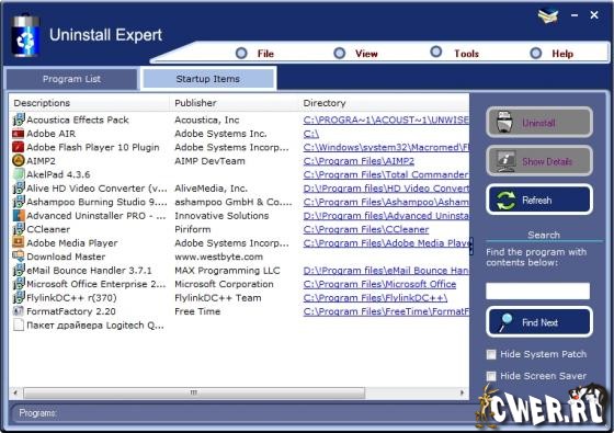Your Uninstaller! - незаменимый помощник по деинсталляции приложений, установленных на вашем компьютере. Он служит заменой стандартному диалогу Добавить/Удалить программу Windows. При этом работает приблизительно в 5-10 раз быстрее. Может показывать соответствующие значки приложений. Имеется функция поиска приложения по ключевому слову.