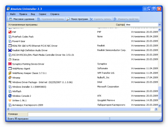 Утилита для деинсталляции установленных программ, которая полностью вычищает оставшиеся после удаления ключи реестра.Также Absolute Uninstaller имеет возможность очистки реестра, жесткого диска и редактирования списка автоматически загружаемых программ.