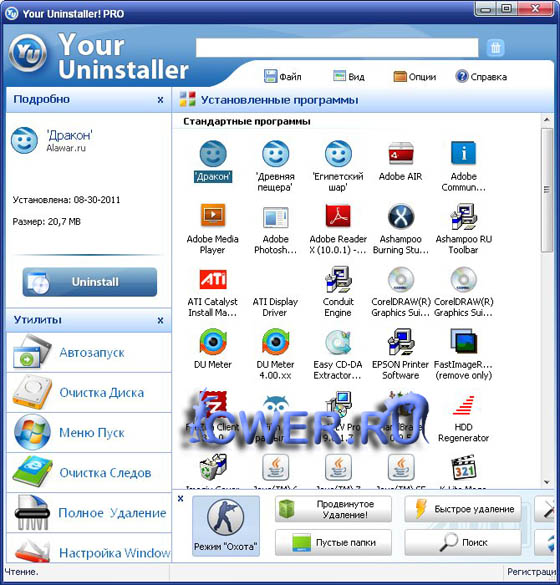 Your Uninstaller обеспечивает решение задач по деинсталляции приложений, установленных на вашем компьютере. Подсвечивает недавно установленный «софт» и автоматически вычищает оставшиеся после удаления ключи реестра и файлы. Уборка мусора, впрочем, одними приложениями не ограничивается. Также можно запросить список автоматически загружаемых программ и контекстное меню Internet Explorer. Может показывать соответствующие значки приложений. Имеется функция поиска приложения по ключевому слову. Автоматически обнаруживает неисправные ключи реестра и полностью удаляет их по вашему разрешению. Возможно ручное удаление записей об установленных программах из системного реестра. Имеет приятный и удобный пользовательский интерфейс, также программа имеет русскоязычный интерфейс.