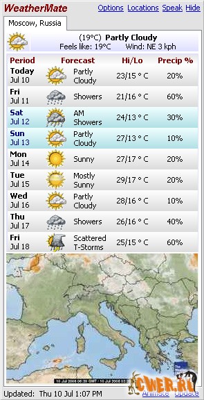 Маленькая и очень удобная программа покажет Вам текущую погоду в любом городе мира. Может висеть в трее - тогда Вы всегда будете в курсе, какая погода за окном. Также доступны прогнозы на день и на неделю, космоснимок, данные о влажности, дальности видимости, влажности, давлении, точке росы, заходе и восходе солнца, облачности и различных погодных условиях. Кроме того, программа сможет озвучить Вам всю эту информацию.