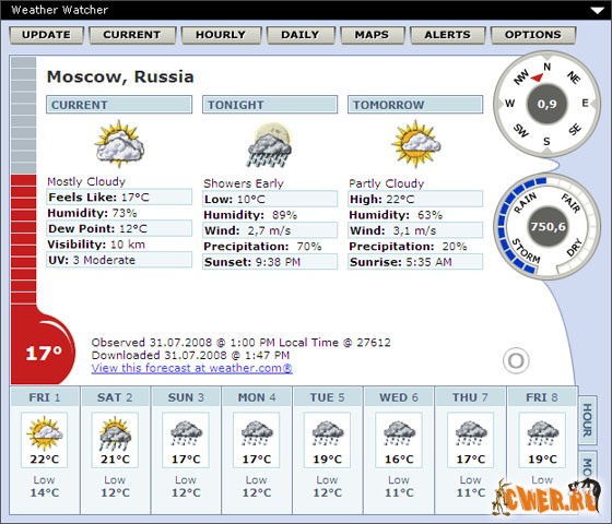 Weather Watcher - программа, позволяющая получать сводку погоды в выбранном регионе для любого города по всему миру. Можно смотреть данные о погоде как по дням недели, так и по часам. Weather Watcher - небольшая настольная погодная станция, которая спокойно "сидит" в системном трее и автоматически обновляет сведения о погоде в указанном интервале времени. Weather Watcher покажет Вам текущий прогноз, включая температуру, температуру "на ощущение" (т.е. температуру, которая будет ощущаться одетым по сезону человеком), влажность, ветер, видимость, давление, и ультрафиолетовое излучение. Weather Watcher может также дать Вам 10-дневный прогноз, который включает общие состояния окружающей среды, температурные максимумы и минимумы и ожидаемое ультрафиолетовое излучение. Погодные измерения могут быть показаны в метрических или английских единицах. Кроме этого Есть возможность просмотра текущих спутниковых фотографий выбранной страны.