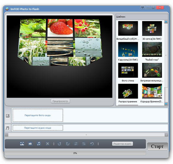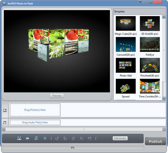 ImTOO Photo to Flash - программа для создания динамических фотогалерей из ваших фотографий с возможностью наложения музыкального сопровождения и конвертации их во flash формат (swf) и формат flash-HTML для публикации готовой интернет страницы. Для импорта подойдут любые изображения в форматах JPG, JPEG, PNG, GIF, BMP, TIFF, XBM и XPM. Выберите flash шаблон и добавьте фоновую музыку.