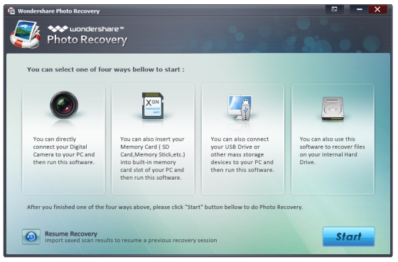 Wondershare Photo Recovery - программа для восстановления утерянных или поврежденных фотографий, видео и музыки с компьютера, фотоаппарата, USB флеш карты, SD карты и других устройств. Если вы случайно удалили файлы, отформатировали диск или потеряли все фотографии вследствие поломки компьютера - Wondershare Photo Recovery поможет восстановить их в несколько щелчков мышки.