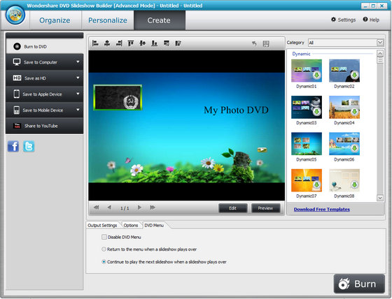 Wondershare DVD Slideshow Builder - является простым в использовании, но мощным инструментом для создания из слайд-шоу DVD фильмов. Вы можете объединить ваши фотографии и видео клипы в DVD слайд-шоу добавить музыку и 2D/3D эффекты перехода. Созданные вами слайдшоу Вы можете просматривать по телевизору, передать на IPod и другие устройства, загрузить на Youtube или Facebook. В программе представлено множество различных шаблонов и эффектов на ваш выбор.