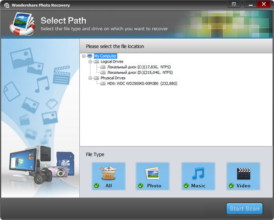 Wondershare Photo Recovery - программа для восстановления утерянных или поврежденных фотографий, видео и музыки с компьютера, фотоаппарата, USB флеш карты, SD карты и других устройств. Если вы случайно удалили файлы, отформатировали диск или потеряли все фотографии вследствие поломки компьютера - Wondershare Photo Recovery поможет восстановить их в несколько щелчков мышки.