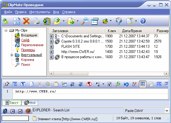 В процессе работы с компьютером мы настолько часто используем сочетание "горячих" клавиш, что просто не обращаем на это внимание. Одни из самых используемых сочетаний - ctrl+c (копирование) и ctrl+v (вставка). Первая операция копирует выделенный текст или рисунок в буфер обмена, вторая - вызывает содержимое буфера обмена. Казалось бы, все проще простого и ничего нового в процессе copy-paste изобрести нельзя. И все же… Разработчики компании Thornsoft постарались по-новому подойти к идее буфера обмена, в результате чего ими была создана программа под названием ClipMate. Программа сохраняет любые данные (графика, текст и т. д.), которые пользователь в процессе работы копирует в буфер обмена. Кроме этого ClipMate следит за любыми производимыми действиями на компьютере (например, за копированием и перемещением файлов или папок), все это фиксируется в программе и остается в ней до тех пор, пока сам пользователь не решит удалить все накопленные данные.
