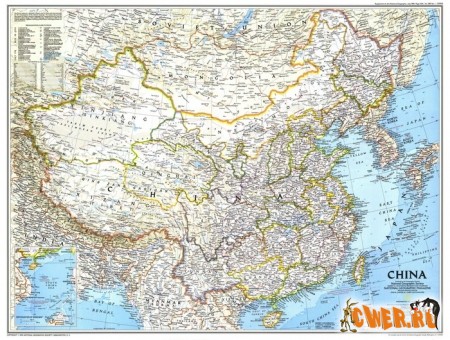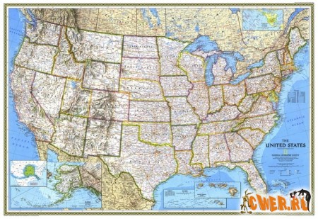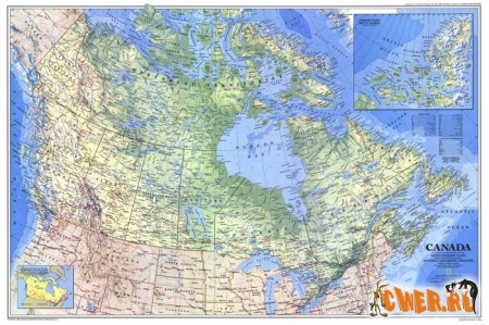 Физическая карта мира от научного общества National Geographic. Карта в разрешении 6000x4194. Содержит имена всех вершин, морских и океанических впадин, с указанием их высот и глубин соответственно.