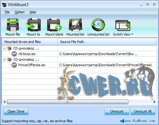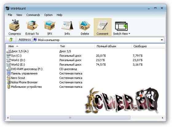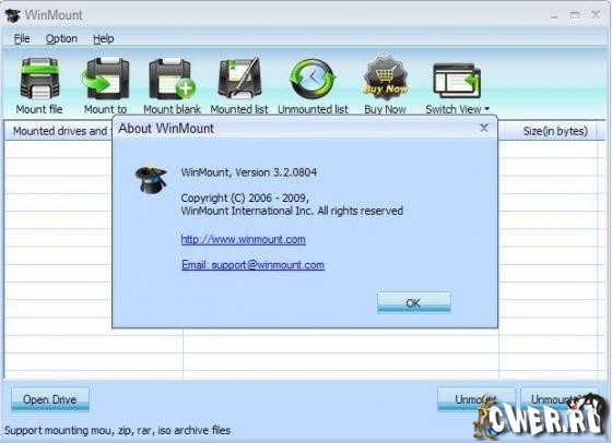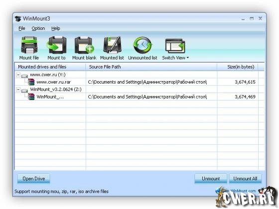 WinMount – программа для управления архивами и файлами образами. WinMount позволяет создавать ZIP, RAR, ISO и другие архивы и использовать в них файлы, без необходимости непосредственного извлечения. Кроме того, программа поддерживает почти все форматы файлов-образов: ISO, CUE/BIN, CCD, BWT, MDS, CDI, NRG, PDI, B5T и ISZ, и может работать в качестве CD- и DVD-эмулятора. WinMount совместима с Windows Vista, XP, 2003, 2000, NT.