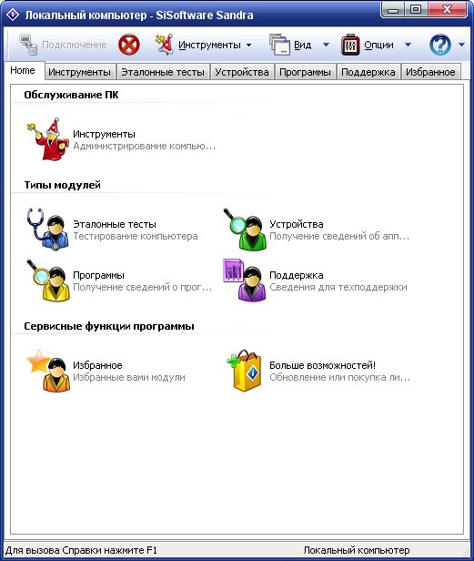 SiSoftware Sandra - системный анализатор для 32-х и 64-битных версий Windows, включающий в себя тестовые и информационный модули. Sandra старается превзойти другие подобные утилиты и показать реальную картину, объединяя в одной программе возможности для сравнения производительности как на высоком, так и на низком уровне. Вы можете получить сведения о процессоре, чипсете, видеоадаптере, портах, принтерах, звуковой карте, памяти, сети, Windows, AGP, соединениях ODBC, USB2, Firewire, и других.