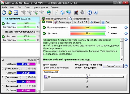 Hard Disk Sentinel Pro - утилита для мониторинга и контроля состояния жестких дисков. Позволяет определить потенциальные проблемы, снижение производительности и возможные сбои. Может предупредить пользователя в случае обнаружения неполадок или превышения температуры.Ее возможности явно не покажутся лишними, особенно в случае особой ценности хранимых данных при росте объема накопителей. Программа отслеживает статус жестких дисков, включая показатели температур и параметры S.M.A.R.T. (Self-Monitoring, Analysis and Reporting Technology, технология, встроенная в большинство современных накопителей) для каждого жесткого диска. Также измеряет скорость передачи данных в реальном режиме (данный показатель может быть использован для тестирования или определения случаев заниженной производительности в тех или иных ситуациях).