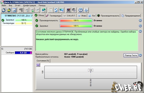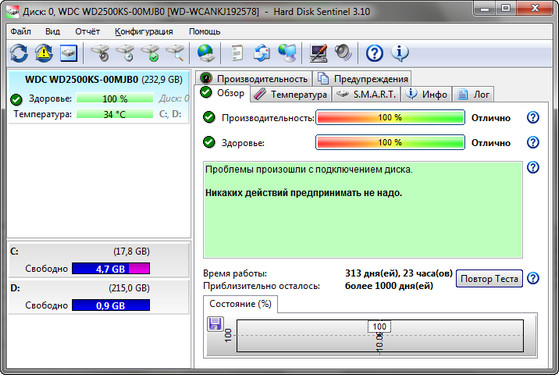 Hard Disk Sentinel - утилита для мониторинга и контроля состояния жестких дисков. Позволяет определить потенциальные проблемы, снижение производительности и возможные сбои. Может предупредить пользователя в случае обнаружения неполадок или превышения температуры.