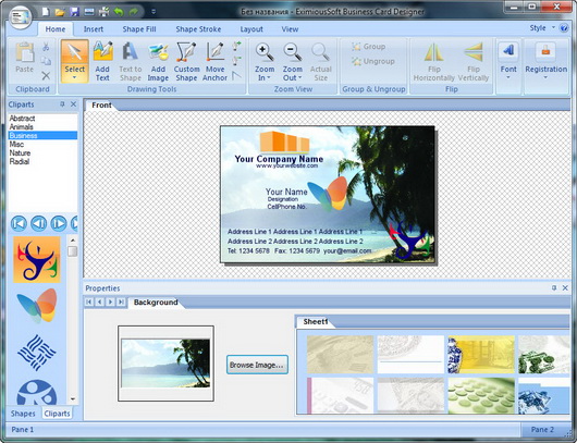 EximiousSoft Бизнес Card Designer - является мощным, но простым программным обеспечением для создания визитных карт. С данной программой, вы можете создавать свои собственные визитки, профессионального качества. Программа поддерживает экспорт в файлы изображений с высоким разрешением для типографии и печати карт непосредственно с вашего принтера. Есть возможность добавить тени, настройки для фигур, символов и текстов.