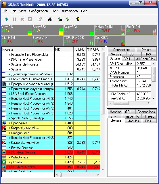 TaskInfo – мощное системное средство, сочетающее в себе функции менеджера процессов и программы для отображения системной информации. Выводит сведения о процессах и их нитях, которые выполняются на данном компьютере в режиме реального времени, подсчитывает процессорное временя, которое они занимают (в процентах и минутах), отображает тип процесса, его модули, переменные, память и другую полезную информацию. Позволяет управлять все теми же процессами, например, принудительно завершать или менять их приоритет.