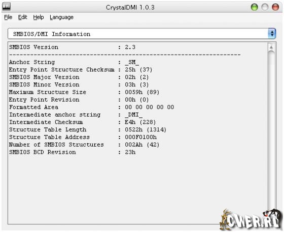 CrystalDMI - это небольшая утилита, показывающая всю информацию из BIOS. CrystalDMI выдает данные о SMBIOS/DMI, может сделать дамп BIOS, VGA BIOS, Ext. BIOS.