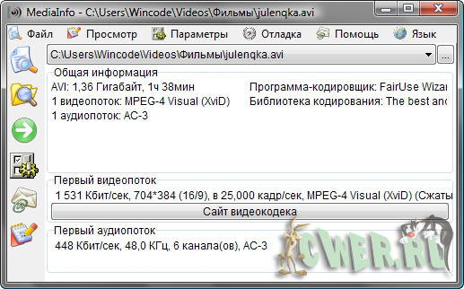 VideoInspector - отображает информацию о видеофайле - сведения о видеокодеке, которым был закодирован файл, об аудиокодеке, видеоразрешении, FPS, BitRate, Qualite Factor и другие. Поддерживаются форматы AVI, Matroska, MPEG I, MPEG II, QuickTime. Кроме этого, VideoInspector имеет еще одну очень полезную опцию, а именно возможность быстрого перехода на веб-страницу для загрузки недостающего кодека.