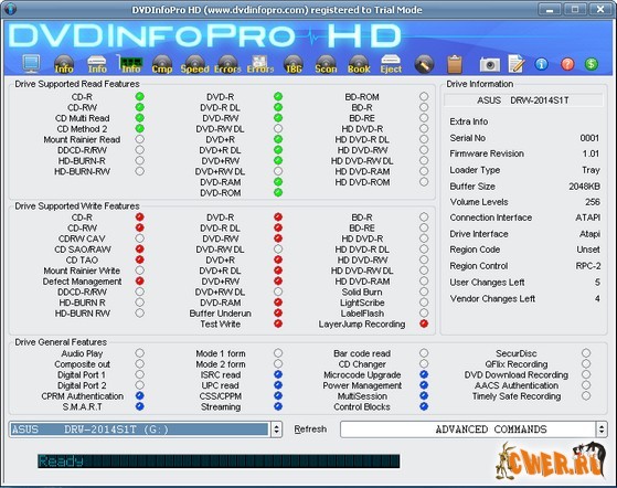 DVDInfo Pro - утилита для тестирования и получения подробной информации о CD/DVD-приводах. Кроме этого, данная программа позволяет тестировать установленные в привод компакт-диски и DVD, а также быстро стирать и форматировать диски DVD-R/RW и DVD+R/RW. Поддерживаются практически все виды приводов, включая DVD+R DL (Double Layer), и все виды дисков, включая Blu-ray и HD-DVD. В последних версиях программы интегрирована поддержка устройств USB и FIREWIRE и таких технологий, как DDCD, Mt Rainier и HD-BURN. При желании вы сможете изменить цвета представления программных настроек и сделать скриншот окна, в котором выводятся параметры диска...