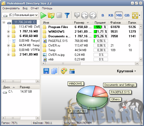 Directory Size - небольшая и простая в использовании программа, визуально представляющая информацию о том, как распределено пространство на жестком диске вашего компьютера. Данная полезная утилита поможет вам узнать какой размер имеют папки на вашем жестком диске, какие файлы и папки самые большие на вашем компьютере или в отдельной директории, а также файлы каких типов хранятся на компьютере, сколько их и каков их размер. Позволяет отображать размер в байтах, килобайтах, мегабайтах и гигабайтах. Также имеет несколько режимов отображения результата, включая файлы и папки, только расширения и т.д. Стоит отметить, что интерфейс программы переведен на несколько языков, включая русский. Программа является эффективным и удобным инструментом для эффективного контроля содержания ваших дисков.