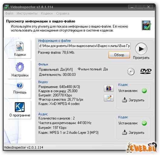 Программа проанализирует видео-файл и выдаст полную информацию об используемых кодеках, битрейте, размере изображения, длительности проигрывания и многое другое. В случае, если файл не проигрывается или проигрывается неправильно, программа найдёт в интернете и установит недостающий кодек.