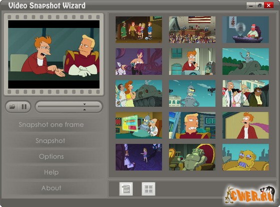 Video Snapshot Wizard - это утилита для записи на диск отдельных кадров из фильмов. Поддерживаются следующие видео форматы: AVI, FLV, ASF, MOV, RM, RMVB, WMV, MKV, VOB, MPG, MPEG и др. В отличие от других программ подобного рода может редактировать кадры, записывать их в BMP, JPG, GIF и даже создавать анимированные GIF картинки и кино галлереи.
