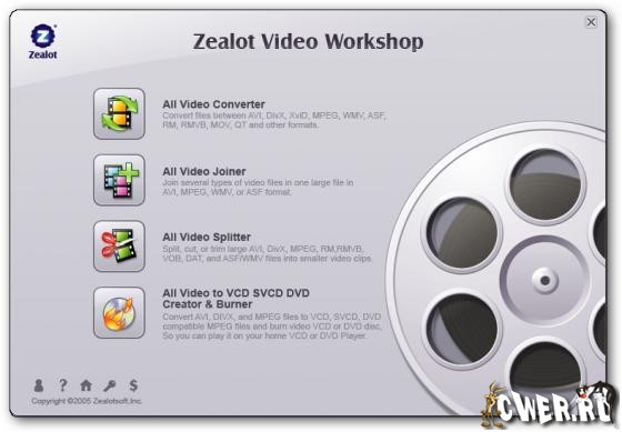 Zealot Video Workshop это конвертер видео файлов различных форматов, нарезка и соединение видео файлов, создание и запись видео CD, DVD.