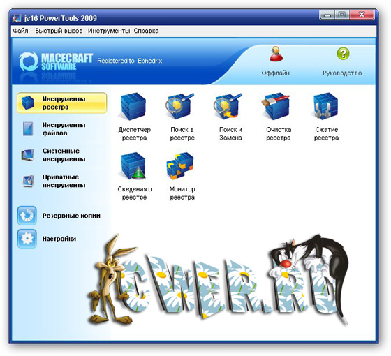 jv16 PowerTools - одна из лучших программ для работы с системным реестром. Включает в себя инструменты для работы с реестром: мощный менеджер реестра - позволяет работать со списком программ из автозагрузки и деинсталляции, со списком зарегистрированных в системе типов файлов, расширений, контекстным меню IE (с тем, в которое часто вставляют свои пункты менеджеры закачек) и некоторыми другими. Этот менеджер часто помогает вручную удалить остатки после автоматической очистки реестра программы. Возможно использование в локальной сети.