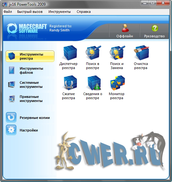 jv16 PowerTools 2009 - это одна из лучших программ для работы с системным реестром и поддержания в оптимальном состоянии. Включает в себя инструменты для работы с реестром: мощный менеджер реестра - позволяет работать со списком программ из автозагрузки и деинсталляции, со списком зарегистрированных в системе типов файлов, расширений, контекстным меню IE (с тем, в которое часто вставляют свои пункты менеджеры закачек) и некоторыми другими. Этот менеджер часто помогает вручную удалить остатки после автоматической очистки реестра программы. Возможно использование в локальной сети.