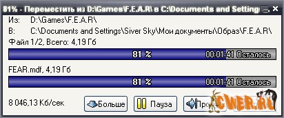 Несколько разнообразит монотонный процесс копирования файлов, особенно если предстоит скопировать большой обьем данных: вместо стандартного малоинформативного окна во время копирования (перемещения) выводит свое собственное, в котором показывает всевозможную информацию о проходящем процессе - скорость, обьем данных, полный путь к копируемым файлам, оставшееся время и многое другое.