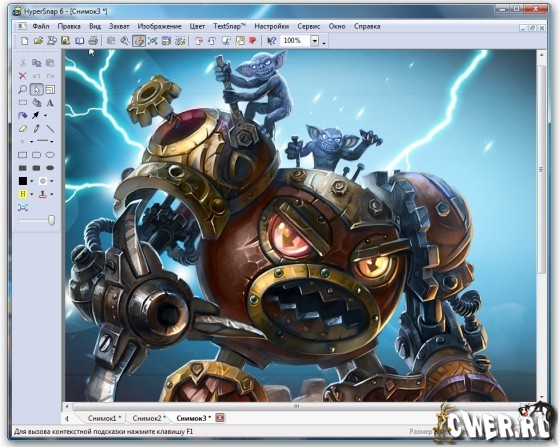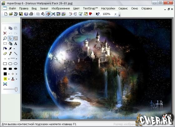 HyperSnap объединяет в себе первоклассную программу для “снятия” изображений с экрана монитора с современными инструментами редактирования полученных снимков. Необходим практически всем от домашнего пользователя, работника офиса, геймера до рекламных агентов или разработчиков обучающих программ и презентаций. Управляется легко и просто горячими клавишами или голосом. Захватывает: целиком или часть окна с рамкой или без рамки, кадры из фильмов или игр DirectX / Direct3D или 3Dfx Voodoo или использующих технологию DirectInput (Destruction, Formula 1 2000, PBA Tour Bowling и др.). Дополнительные возможности: захват текста и таблиц Excel MS; преодоление трудных к захвату моментов в DirectX ™ и Glide™; непрямоугольный захват; захват длинных страниц скроллом; конвертация и сохранение в более чем 20ти графических форматах и многое, многое другое.