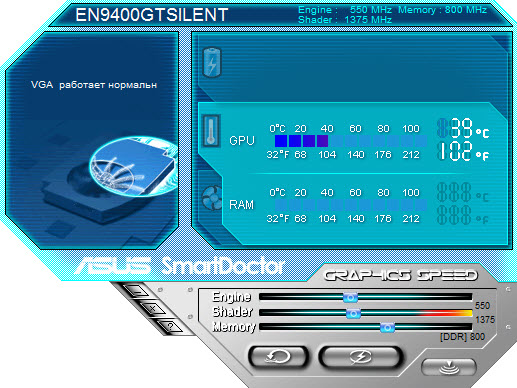 Smart Doctor - фирменная утилита от ASUS, предназначенная для видеокарт, созданных на графических чипсетах от ATI и NVIDIA. Данная программа позволяет пользователю с легкостью отслеживать состояние видеокарты, сообщая обо всех неисправностях, которые возникают (будь то перегрев, остановка вентиляторов и другие проблемы), а также сообщать о температуре чипсета, скоростях вращения вентиляторов и т.д. Кроме того, программа поддерживает технологию Smartcooling и позволяет настраивать некоторые параметры видеокарты вручную.