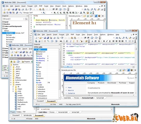Blumentals WeBuilder 2008 v9.0.0.95 - профессиональный редактор веб-страниц. С его помощью можно отлаживать программный код на html, php, asp, perl, css, javascript, vbscript, ssi. Вы можете быстро и легко вставлять таблицы, любые элементы web-форм, скрипты. При этом в коде не будет мусора. Из важных для вебмастера вещей, в нём есть возможность просмотра страницы во внутреннем броузере и кода и просмотра одновременно. То, чего не содержит в такой удобной форме ни один известный html-редактор - вставка цвета, который можно выбирать из нескольких цветовых палитр, причем Вы видите и сам цвет и его обозначение в 16-ричном формате.
