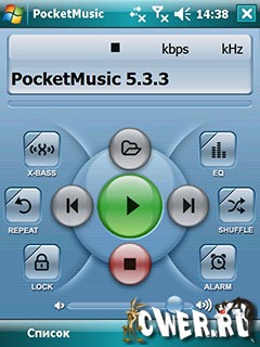 PocketMusic Player - продвинутый аудио-плеер с 10-полосным эквалайзером проигрывает музыку в форматах MP3, Ogg Vorbis и WMA. Есть вариант интерфейса с крупными кнопками, ориентированный на работу в горизонтальном положении экрана.