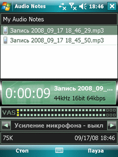 Resco Audio Recorder - объединяет в себе диктофон и проигрыватель звуковых файлов. Довольно проста в обращении. Главное достоинство - записывает голос в формат MP3.