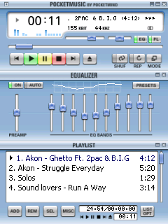 Pocket Music Player продвинутый аудио-плеер с 10-полосным эквалайзером проигрывает музыку в форматах MP3, Ogg Vorbis и WMA. Есть вариант интерфейса с крупными кнопками, ориентированный на работу в горизонтальном положении экрана. Поддержка скинов Winamp. На экране Today можно разместить «органы управления» плеером. Улучшено качество работы эквалайзера (он оптимизирован для работы на процессорах XScale). Также программа Pocket Music Player «научилась» запоминать, на каком месте было остановлено воспроизведение в прошлый раз. А еще есть возможность автоматического сканирования всех папок на наличие аудио-файлов.