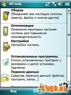 SKTools - позволяет чистить файловую систему и реестр КПК, работать с базами данных, оптимизировать настройки системы и многое другое. Утилита находит и удаляет ненужные временные файлы и папки, историю ссылок IE, копии файлов и.т.п. Также программа позволяет работать с картами памяти - форматирование карт, удаление данных. Программа показывает список установленных программ с указанием занимаемого места и времени установки. Имеются широкие возможности удаления программ.