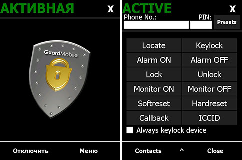 GuardMobile - утилита для обеспечения безопасности и контроля устройства под Windows Mobile. Предназначена для сокрытия данных на украденном девайсе, а также его обнаружения при наличии GPS. Позволяет удалённо управлять некоторыми операциями, например производить HardReset, совершать скрытый вызов для прослушивания и т.п.