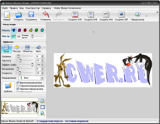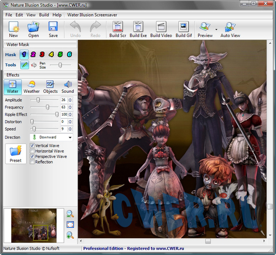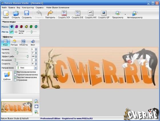 Nature Illusion Studio - программа поможет вам превратить обычные снимки в прекрасные анимированные пейзажи. Программа позволяет накладывать разные графические и звуковые эффекты, и затем конвертировать результат в экранную заставку, исполняемый файл, анимированный рисунок или видео-файл. Загружаете свою любимую фотку с пейзажем, выделяете с помощью масок области, которые нужно оживить (напр. поверхность водоема, ручей, водопад и т.д.), добавляете звук (шум прибоя, пение птиц, журчание воды), можно добавить падающий снег или дождь. Вобщем, теперь вы можете самостоятельно создавать скринсэйверы профессионального качества, делать автоские анимированые GIF на основе ваших фото.
