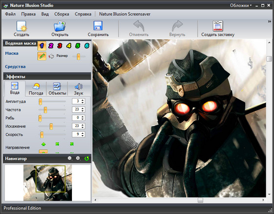 Nature Illusion Studio поможет вам превратить обычные снимки в прекрасные анимированные пейзажи. Программа позволяет накладывать разные графические и звуковые эффекты, и затем конвертировать результат в экранную заставку, исполняемый файл, анимированный рисунок или видео-файл. Загружаете свою любимую фотку с пейзажем, выделяете с помощью масок области, которые нужно оживить (например, поверхность водоема, ручей, водопад и т.д.), добавляете звук (шум прибоя, пение птиц, журчание воды), можно добавить падающий снег или дождь. Теперь вы можете самостоятельно создавать скринсейверы профессионального качества, делать авторские анимированые GIF-ы на основе ваших фото, создать собственный эксклюзивный анимированный аватар. Интерфейс программы прост и интуитивно понятен.