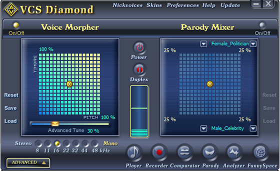 Vooice Changer Diamond Edition - это настоящий прорыв технологии изменения голоса в реальном масштабе времени. Вы сможете превратить ваш голос в женский, дестский, придать сексуальную привлекательность голосу. Встроенный Voice Comparator позволяет имитировать голоса других людей после сравнения и подстройки. Есть готовый пакет для имитации голосов знаменитостей, среди которого, например голос небезызвестного Терминатора.