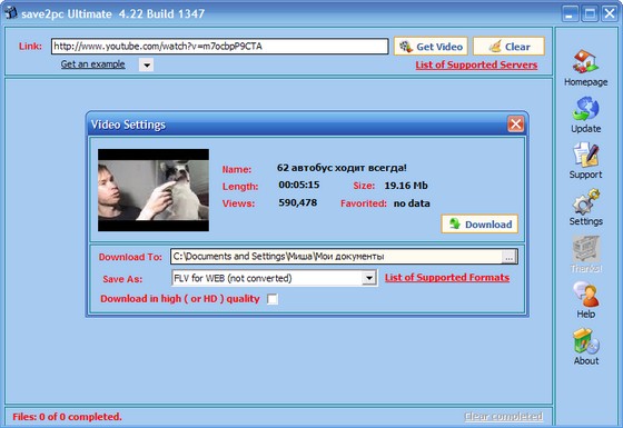save2pc - это крайне простая в использовании утилита, которая позволяет сохранять видео с известного файлового хранилища YouTube и Google Video. Просто вставьте ссылку на нужный файл в окошке программы, укажите папку для сохранения видео, а все остальное save2pc сделает сама, вы же в результате получите интересующий вас .avi, .mpeg, .flvG файл или файл в мобильном формате mov, mp4, 3gp, mp3, wav. В программе возможно просматривать видео без дополнительных кодеков и скачивать нескольких файлов одновременно.